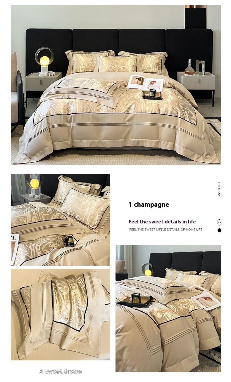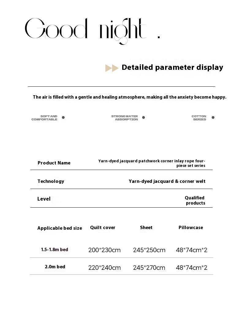 Size specification: 1.5 m bed sheet four-piece set: quilt cover 200*230cm,1.8 m bed sheet four-piece set: quilt cover 200*230cm,2.0 m bed sheet four-piece set: quilt cover 220*240cm,1.5 m fitted sheet four-piece set: quilt cover 200*230cm,1.8 m fitted sheet four-piece set: quilt cover 200 * 230cm