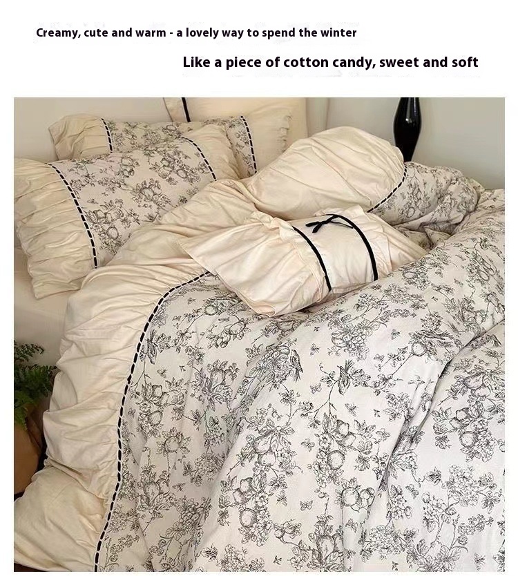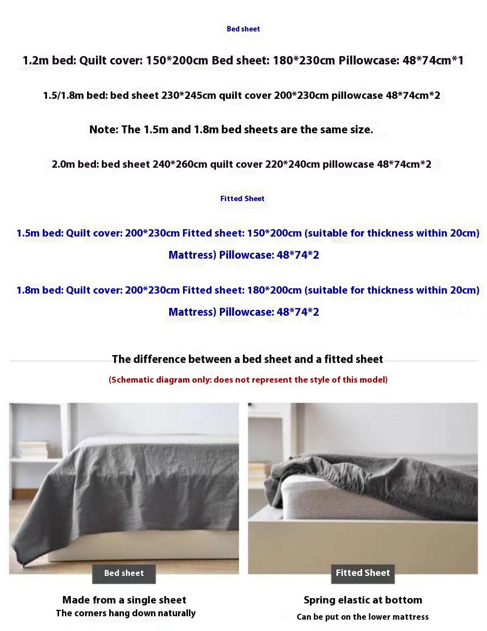 Size specification: 1.2m bed sheet three-piece quilt cover 150 * 200cm,1.5m bed sheet four-piece quilt cover 200 * 230cm,1.8m bed sheet four-piece quilt cover 200 * 230cm,2.0m bed sheet four-piece quilt cover 220 * 240cm,1.5m bed sheet four-piece quilt cover 200 * 230cm,1.8m fitted bed sheet four-piece quilt cover 200 * 230cm